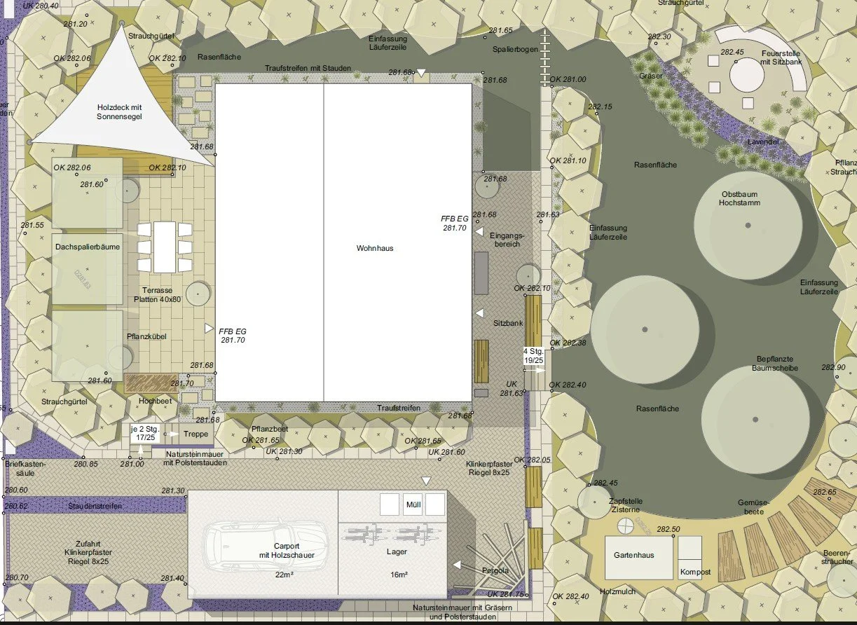 So sieht das ganze dann im Endergebnis aus: Eine auf deinen Garten abgestimmter, maßstabsgetreue Planung, bei der alle Elemente miteinander in Verbindung stehen und diese dennoch in einzelnen Schritten nach und nach umgesetzt werden können: