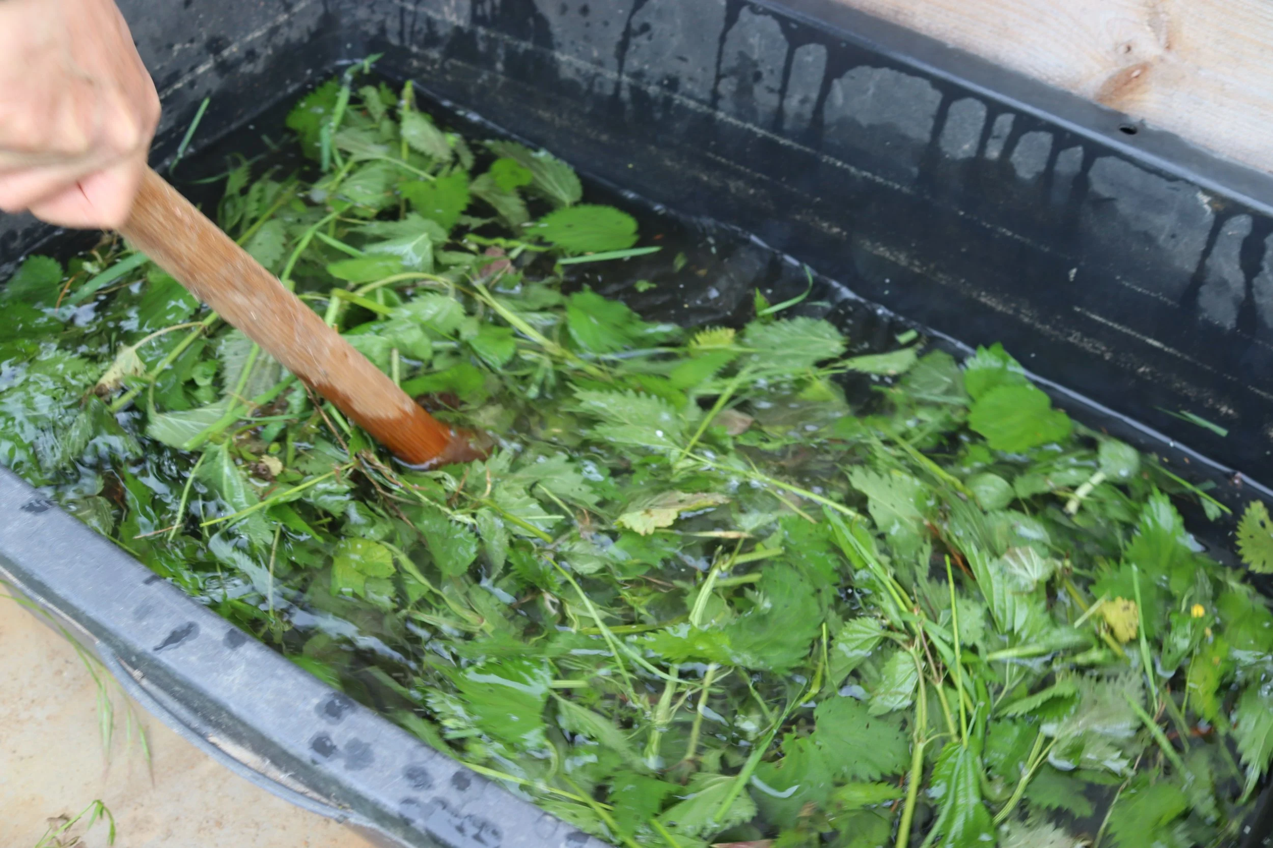 Pflanzenjauche aus Brennnesseln mit Wasser frisch angesetzt