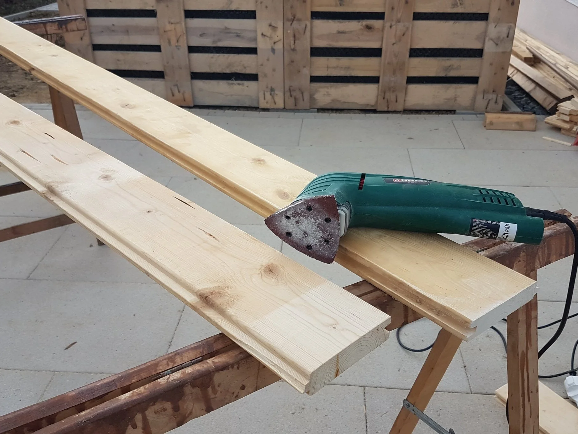 Nun bleibt noch die obere Abdeckung der Unterkonstruktion. Dafür habe ich ebenfalls Reststücke verwendet, in dem Fall von unserem Gartenhaus. Die Bretter musste ich nur noch etwas fein abschleifen und der Länge entsprechend zusägen.