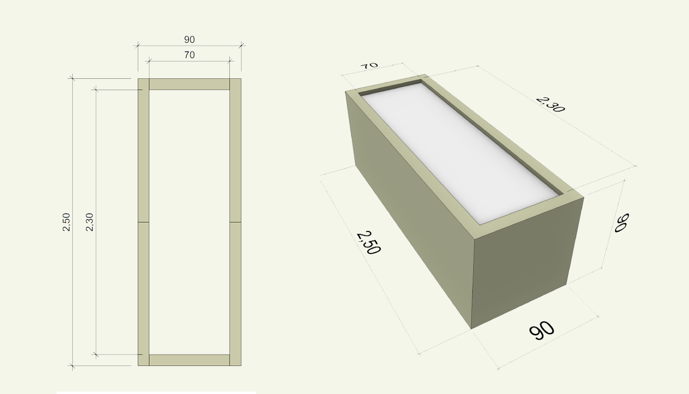 Für unser Hochbeet habe ich eine Konstruktion entworfen, die eine Euro-Palette breit und 2 Paletten lang ist. Es ergibt sich also ein Gesamtaußenmaß von 90 x 2,50 m. Das Innenmaß für die Bepflanzung, abzüglich der Konstruktion, beträgt also 70 x 2,30 m.
