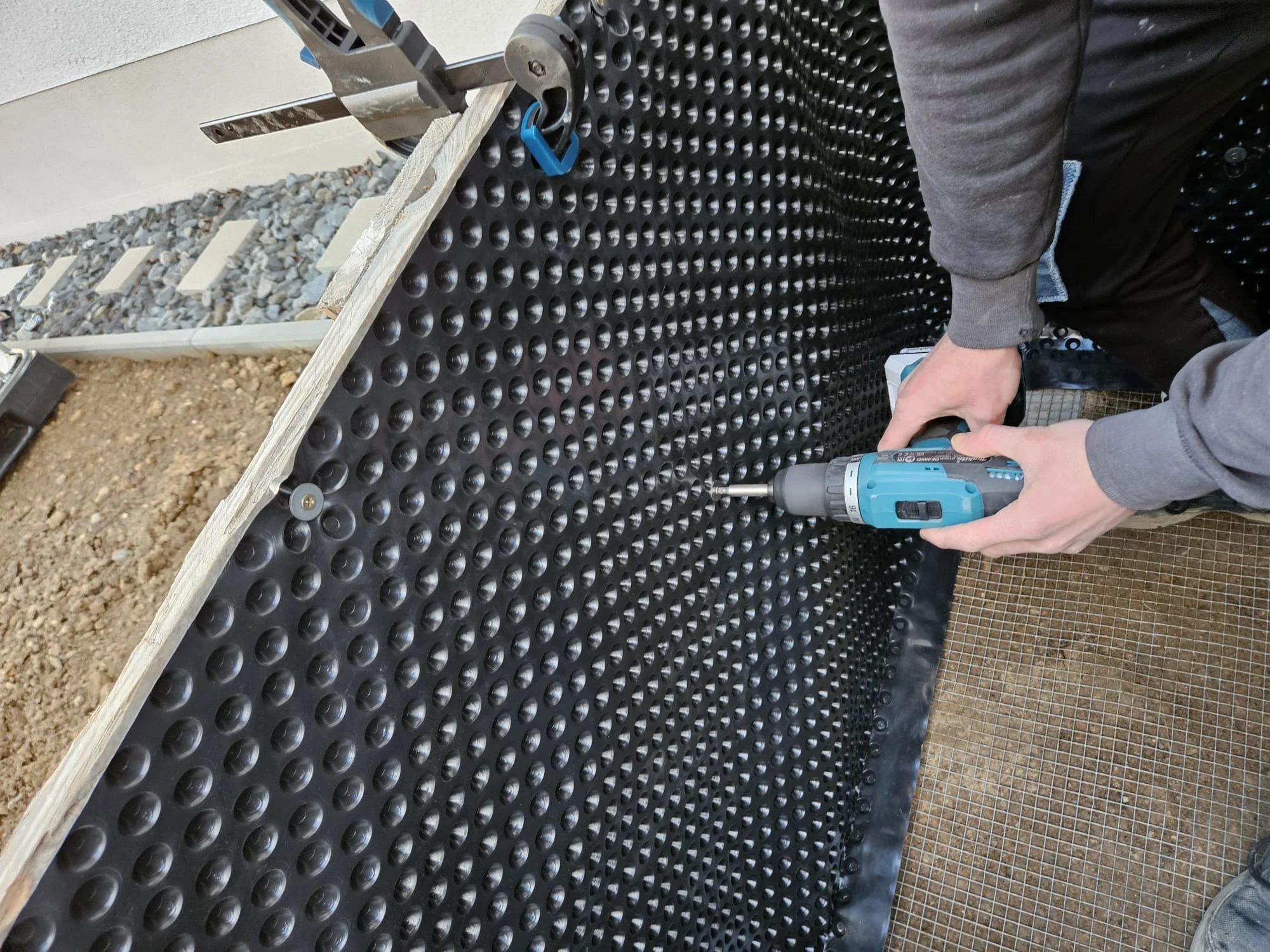 Um die Unterkonstruktion aus Holz zu schützen und für einen möglichst langen Zeitraum zu erhalten, wird eine Noppenbahn aus dem Baubedarf an den Innenwänden befestigt. Das geht am einfachsten mit Schrauben und passenden Unterlegscheiben. Die Unterlegscheiben sind in diesem Fall wichtig, da sich die Schrauben sonst einfach durch die Noppenbahn hindurch drehen.